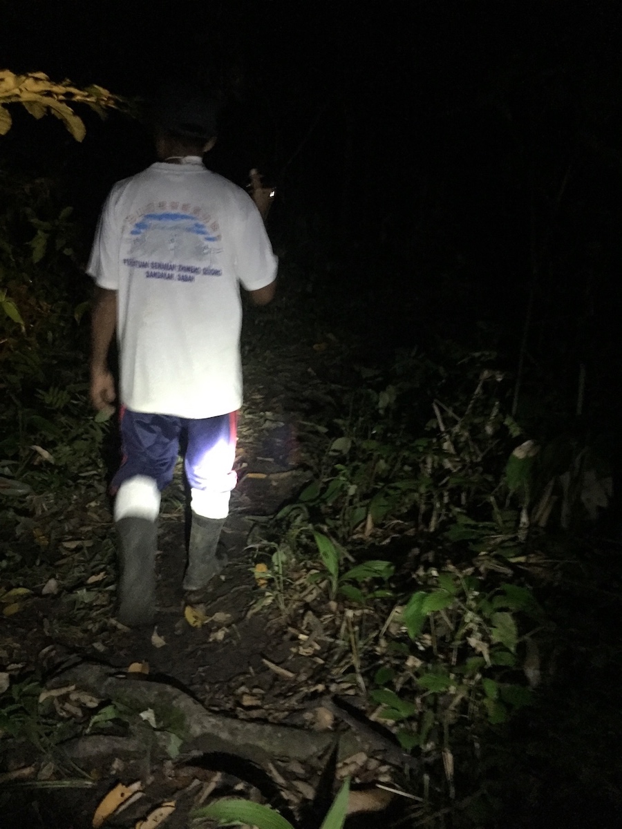 ゲコゲコとカエルのなく声、謎の鳥の鳴き声が夜の熱帯雨林に響きます。珍しい昆虫や小動物、眠っている鳥など、現地のガイドさんは真っ暗闇の中から懐中電灯の光だけで見つけ出します。自分は一歩一歩、恐る恐る進むのだけで精一杯です。途中、ボルネオゾウが通った獣道もありました。