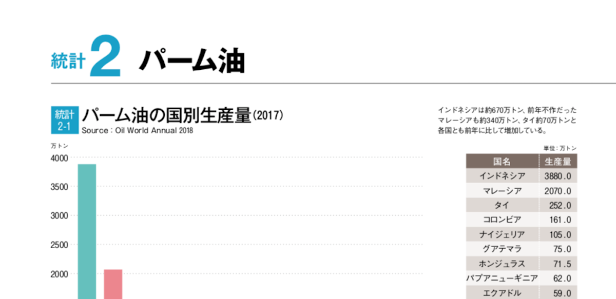 また、毎年同様、信頼性の高い複数のデータをもとに最新の数字を反映したパーム油関連の統計グラフも記載しています。