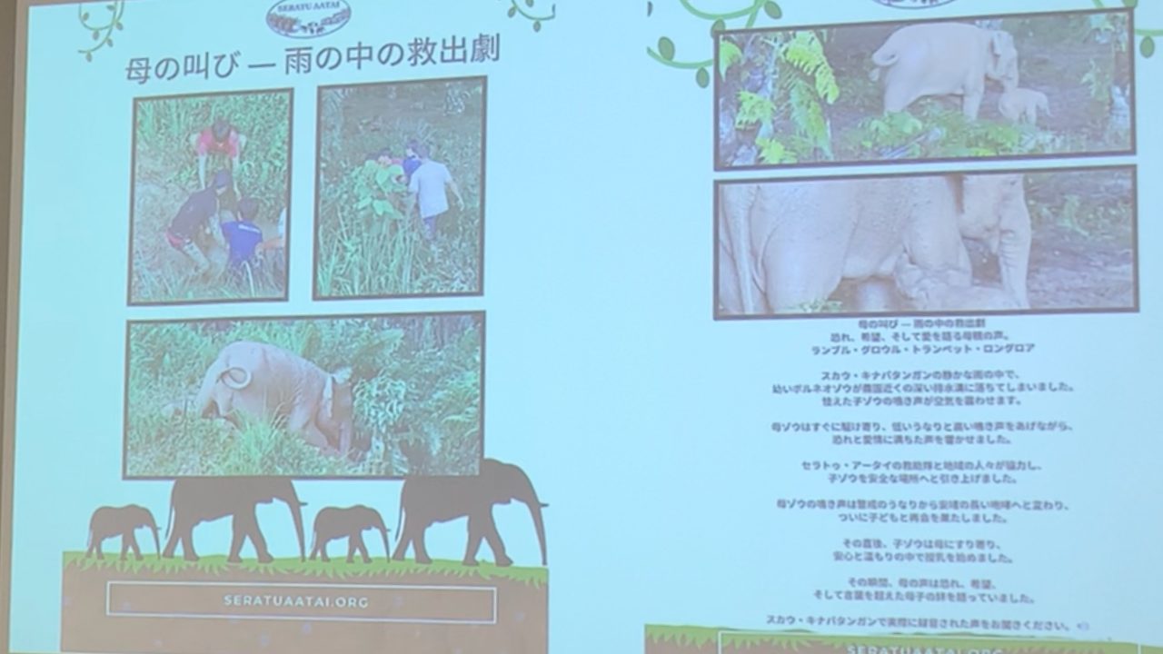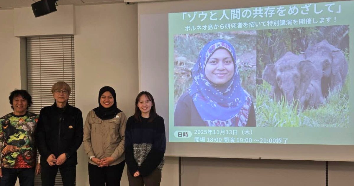 11月13日(木)、「ゾウと人間の共存をめざして」というテーマで行われた講演会に参加しました。講師は、ボルネオ島からお越しくださったゾウ研究者 ヌルザファリナ・オスマン博士。長年、サバ州でボルネオゾウを見守りながら、保全や生態、そして人と野生動物の関係について研究されています。2018年には NGO「Seratu Aatai(セラトゥ・アタイ)」を立ち上げ、地域の人びとと協力しながら現場で活動されています。