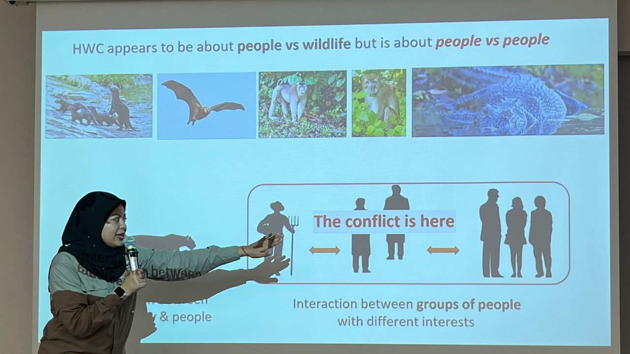 今回の講演でよく聞かれた言葉が 『HWC(Human–Wildlife Conflict)』でした。これは、「人(human)と野生動物(wildlife)の間で起きるトラブル(conflict)」のことです。サバ州ではゾウだけでなく、カワウソ、オオコウモリ、カニクイザル、イリエワニなど、さまざまな動物と人との距離が近く、日常の中でいろいろな問題が生まれているのも事実です。