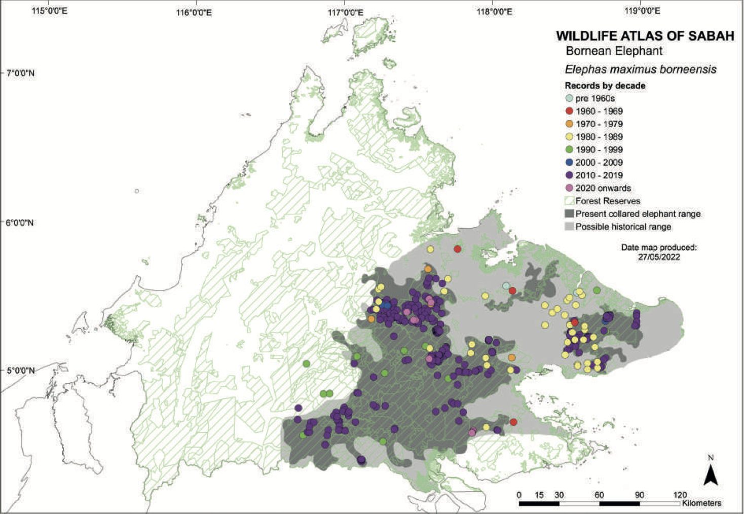 ボルネオゾウは、サバ州にのみに生息しています。その数は約1,000頭ほど。ファリナ博士は2008年からこれまでに20頭以上のゾウにGPS首輪を装着させゾウの移動ルートのデータを収集しています。そのデータ からボルネオ島の中でゾウたちが大きく3つのグループに分かれ、暮らしていることがわかっています。(画像1:濃いグレー)